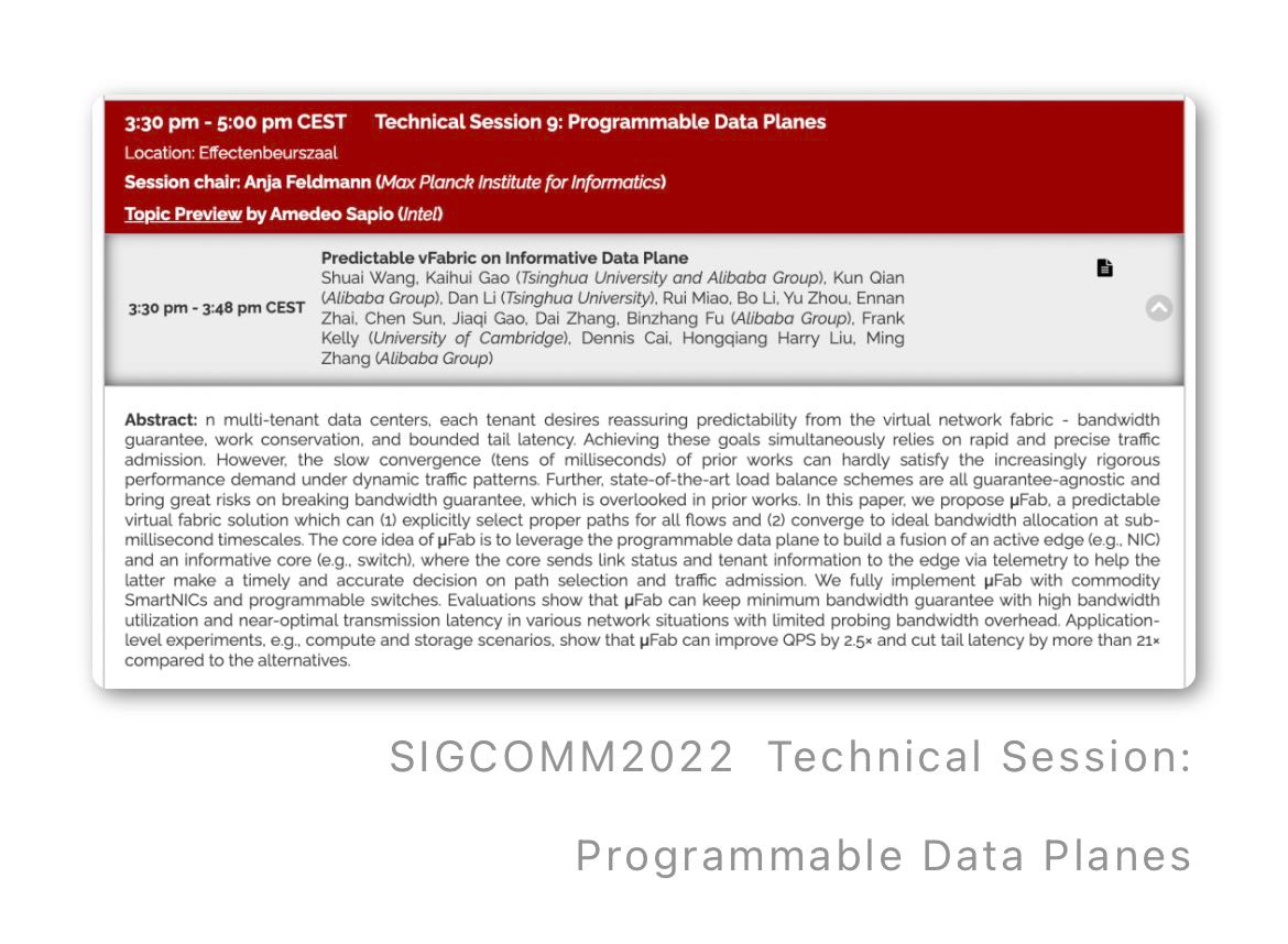SIGCOMM会议是网络领域资历最老的顶级学术会议,入选的论文包括阿里云自研的下一代高性能RDMA网络协议Solar、端网融合可预期数据中心网络架构、可编程网络稳定性保障系统等。