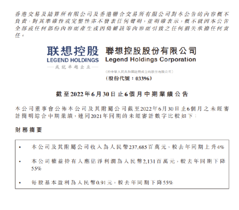 联想控股:上半年公司权益持有人应占净利润21.31亿元,同比下降55%。联想控股港交所8月31日公告称,上半年公司及其附属公司收入人民币2376.85亿元,较去年同期上升4%;上半年公司权益持有人应占净利润21.31亿元,较去年同期下降55%;每股基本盈利0.91元,较去年同期下降55%。