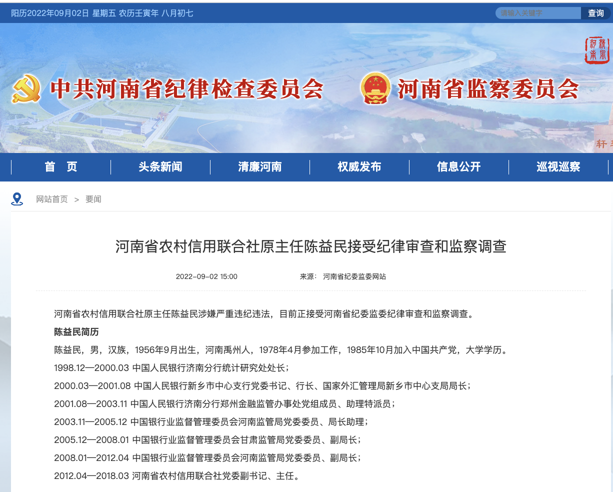 河南省农村信用联合社原主任陈益民接受审查调查。