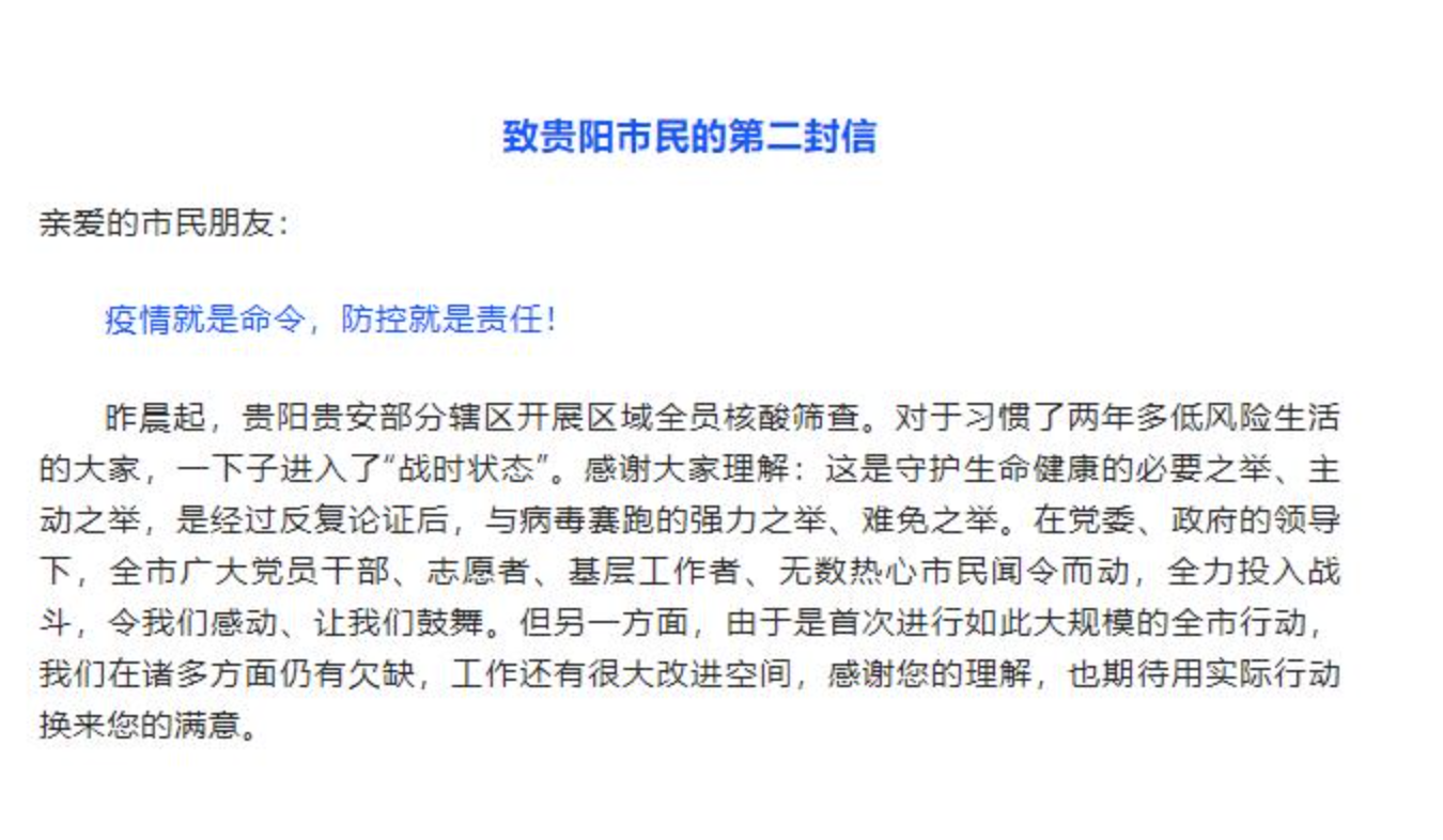 贵阳核酸检测系统登录迟缓,官方:核酸检测还有欠缺,致歉同时全力抢修。9月4日,贵阳市疫情防控现场处置省市联动指挥部发布《致贵阳市民的第二封信》。信中提到,一、核酸检测还有欠缺,让您久等了,我们深表歉意。二、绿叶蔬菜仍显不足,让您担心了,我们全力保供。三、静态居家出门不易,让您烦心了,我们全力抓紧。城市突遇“大考”,每个市民都是答卷人。我们坚信,有党委政府的坚强领导,有各级各部门干部职工的忘我工作,有无数志愿者的积极参与,更有千千万万个如您一样的热心市民,我们一定能打赢这场疫情防控仗。