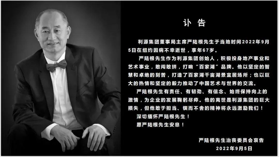 据红星新闻,9月5日,利源集团发布讣告,利源集团董事局主席严陆根先生在纽约因病不幸辞世,享年67岁。在地产大鳄的身份之外,严陆根更广为人知的身份是收藏大师,他不仅了解艺术品的价格,更能深入了解每件艺术品的价值,他曾被评价为“卖掉30亿房子,买入3万幅画”的人。2013年,地产行业风风火火之时,严陆根带领的利源集团华丽转身,转向了文化产业。