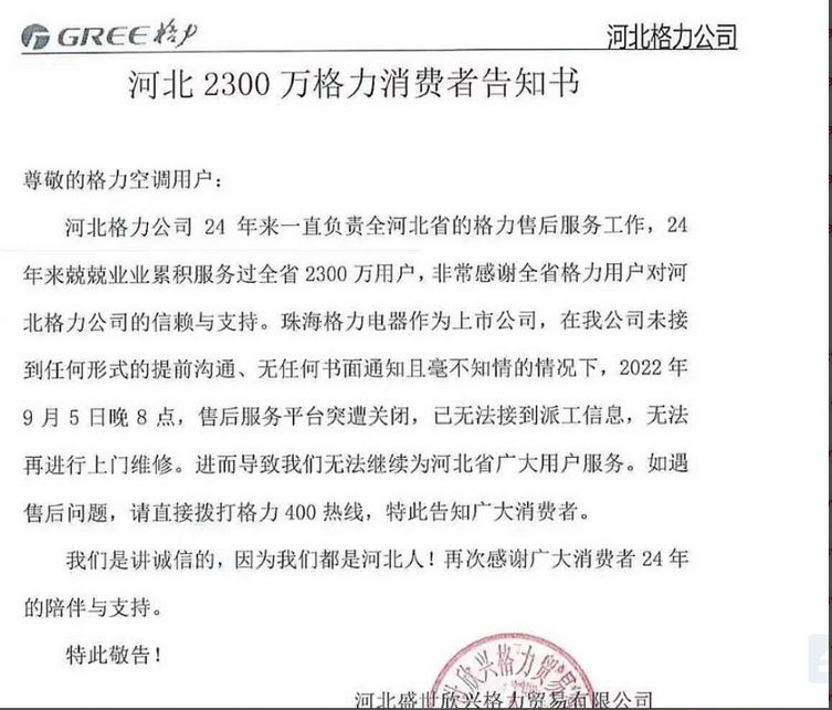 多位经销商人士:河北格力售后服务平台突遭关闭属实。据财联社,今日有网传文件显示,河北格力公司在未接到任何形式的提前沟通、无任何书面通知且毫不知情的情况下,2022年9月5日晚8点,售后服务平台突遭关闭,已无法接到派工信息,无法再进行上门维修。此文件署名为河北盛世欣兴格力贸易有限公司,并盖有公章。财联社记者从多位经销商人士处获悉,此事属实。有经销商表示,河北盛世欣兴今天开始接不到售后派单了。