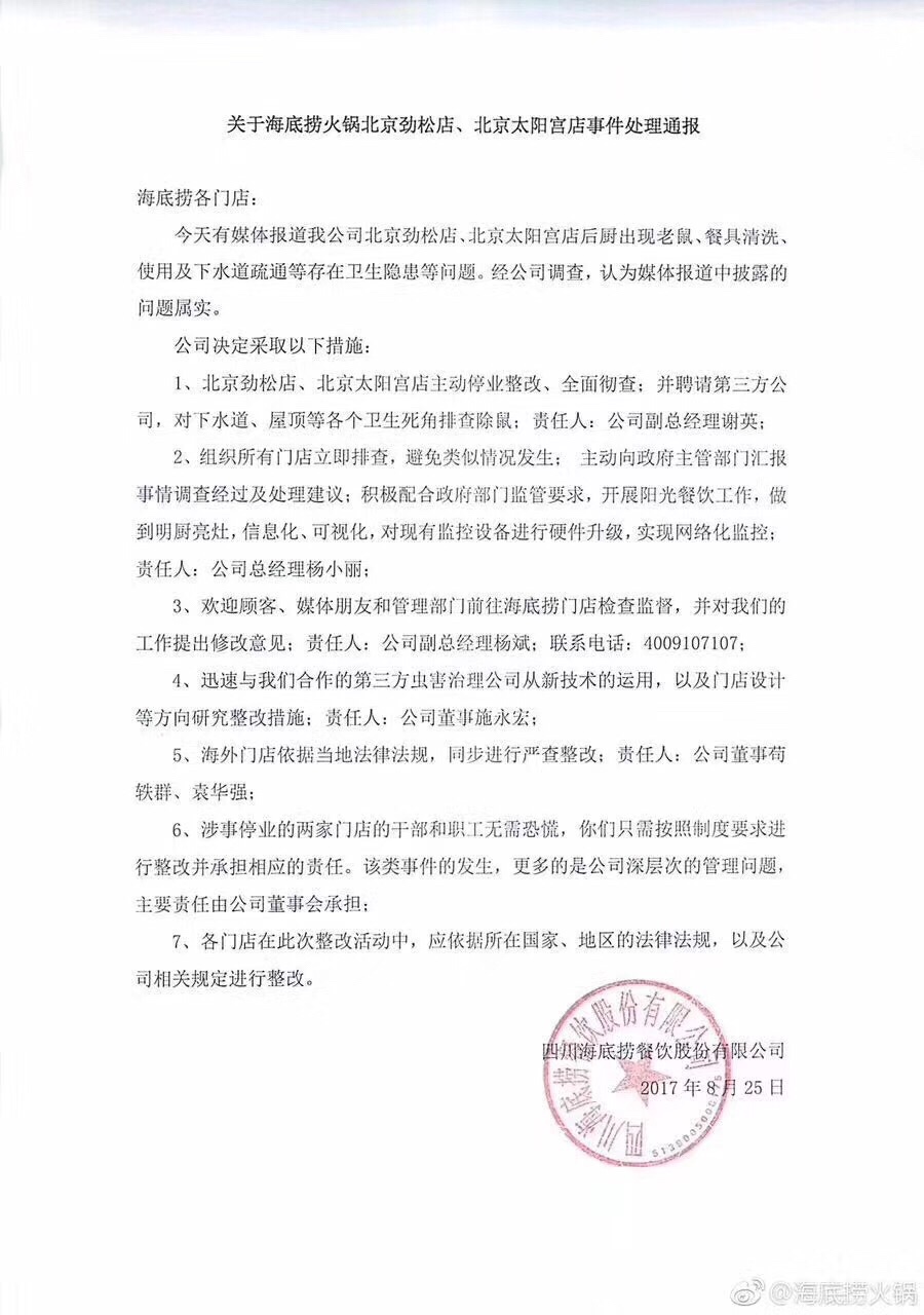 海底捞这个公关满分?我怎么觉得是负分呢…这时候还不忘大量的官话套话废话(遵守有关法律法规就说了好多次,废话没意义),还不忘自high(门店员工你们没任何责任,所以不需要担心,这是公司的责任,但不涉及任何人,海底捞爱员工名不虚传啊,这时候拿来说很做作),很low的声明(中国企业貌似都不习惯纯粹的道歉认错)。食品安全无小事,海底捞做错了本该被惩罚(市场、监管部门),结果还一堆叫好的,不能理解这是什么心态[尴尬]