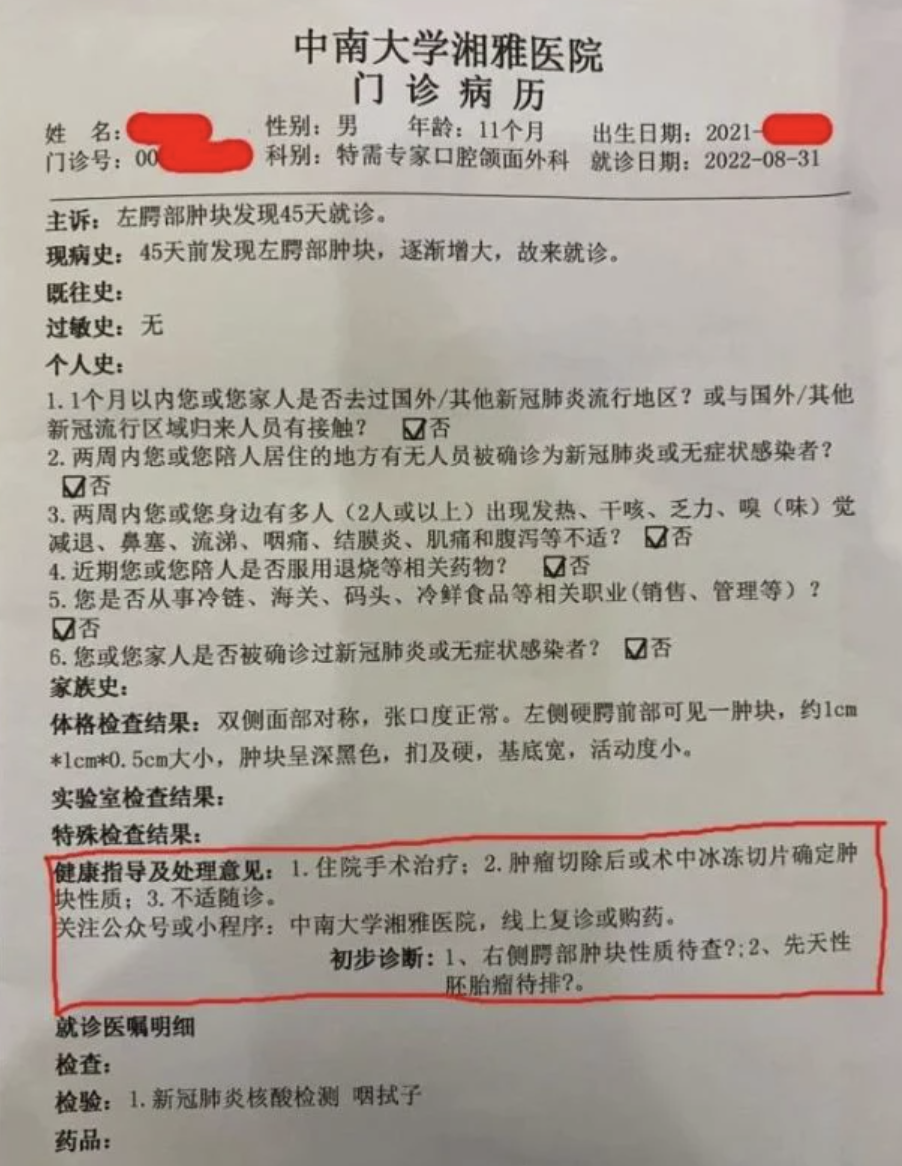 近日,处于舆论风口浪尖的湘雅系医院再次登上热搜。湖南长沙有家长反映11个月大孩子上颚出现黑色肿块,花300元在中南大学湘雅医院看专家号,专家初步诊断疑似肿瘤,待查待排。处理意见是住院手术治疗。