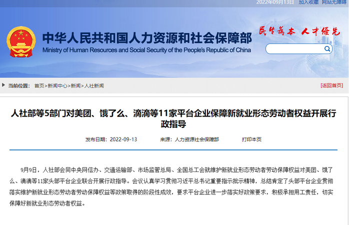 人社部等5部门对美团、饿了么、滴滴等11家平台企业保障新就业形态劳动者权益开展行政指导。人社部会同中央网信办、交通运输部、市场监管总局、全国总工会就维护新就业形态劳动者劳动保障权益对美团、饿了么、滴滴等11家头部平台企业联合开展行政指导。会议总结肯定了头部平台企业贯彻落实维护新就业形态劳动者劳动保障权益等政策取得的阶段性成效,要求平台企业进一步落实好政策要求,积极承担用工责任,切实保障好新就业形态劳动者权益。