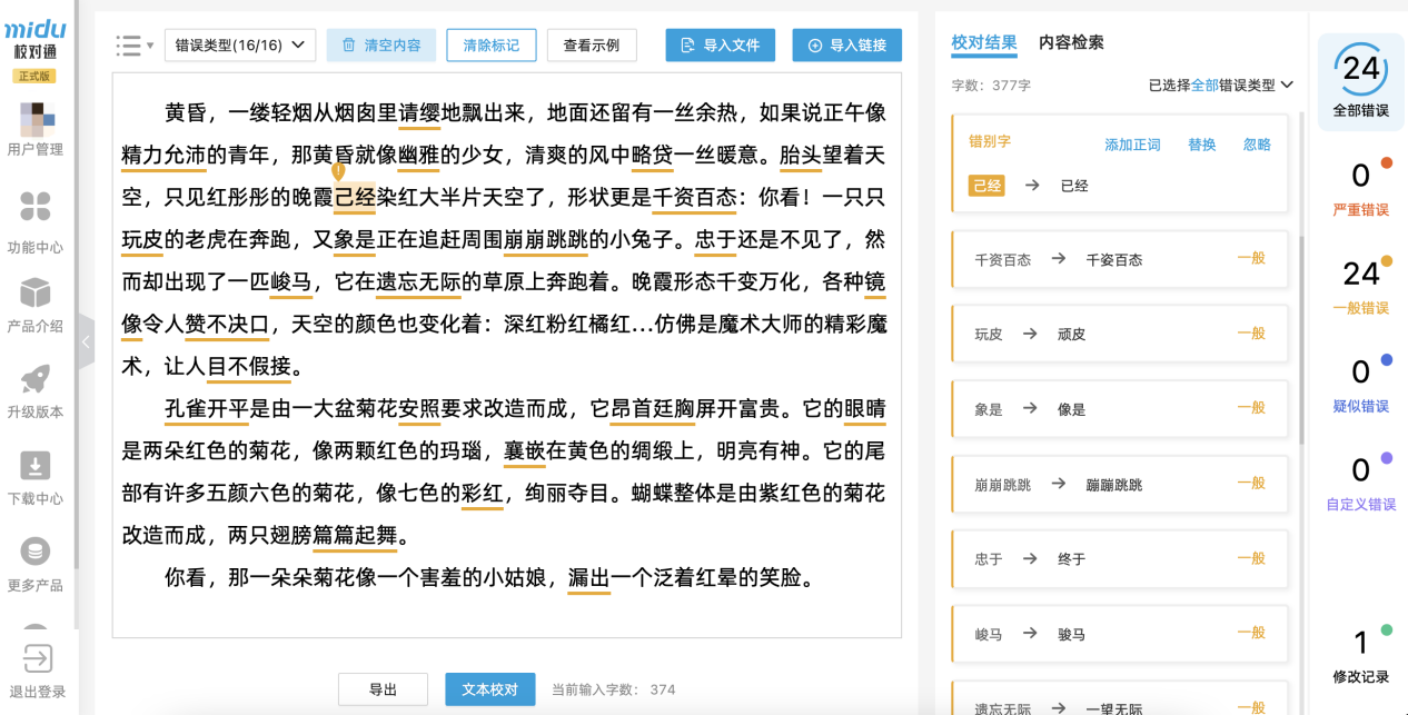 譬如,蜜度旗下“校对通”围绕中文语言特点及使用习惯,设置的25类全栈审核与校对能力,对“错别字、词,多字、少字错误,语义重复,语序错误,句式杂糅,量与单位差错”等内容进行智能审核与校对,解决内容的规范性、安全性、合法性问题。