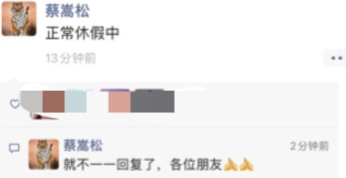 被传失联?蔡嵩松朋友圈深夜回应:正常休假中。9月20日晚间,有传闻传称“蔡姓顶流基金经理本周失联”,这则传闻指向诺安基金旗下顶流基金经理蔡嵩松。对此,蔡嵩松深夜在朋友圈回应称自己“正常休假中”,诺安基金方面也向财联社记者确认了此事。与此同时,蔡嵩松对财联社有关人士回应,确实正在休假中。