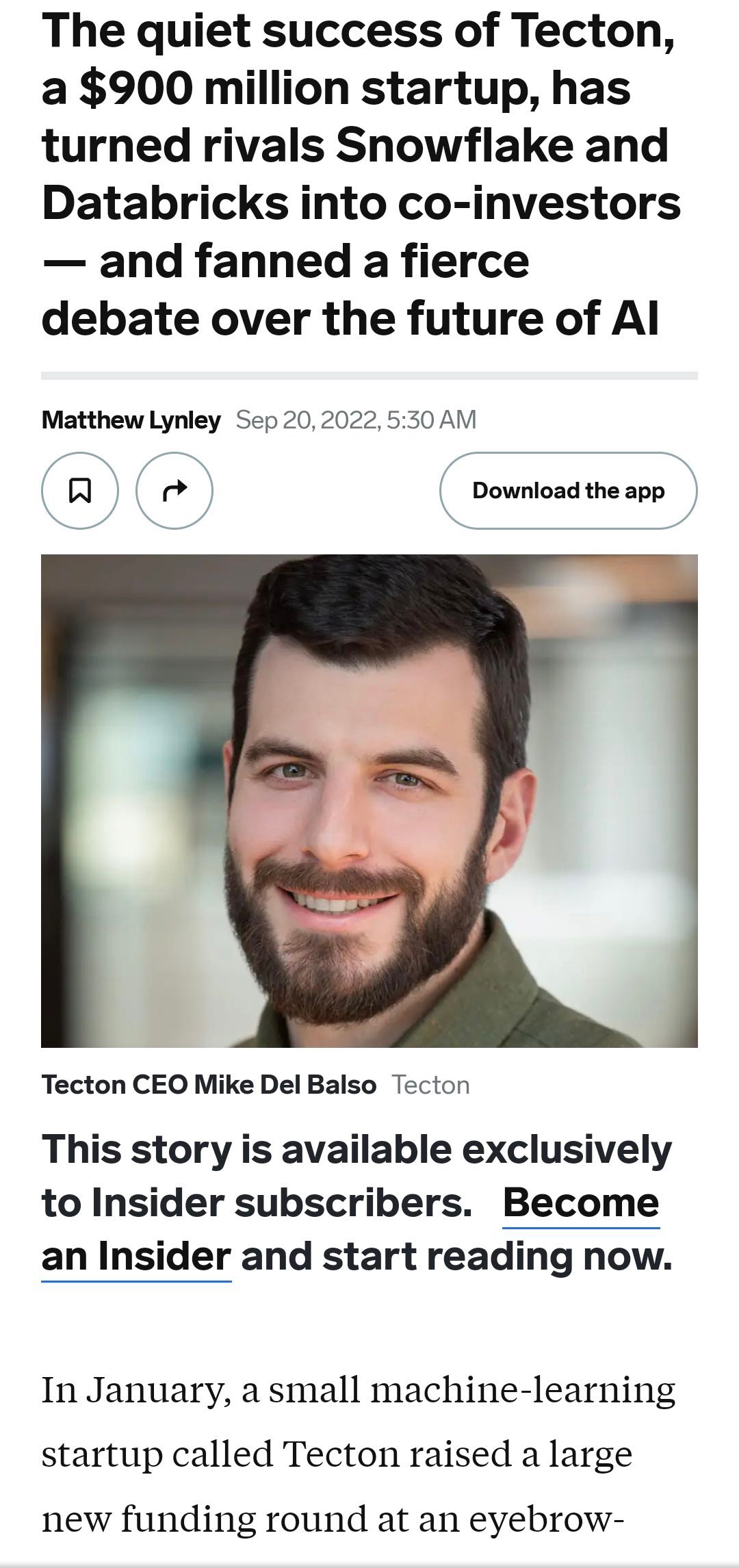 人工智能特征存储库(Feature store )领头羊Tecton公司估值9亿美金。美国的人工智能和机器学习赛道分类十分细分化。有些做MLOps,有些做一个特定领域模型,有做特征存储库(Feature Store),还有些做数据标注。单纯只做做特征存储库的公司国内几乎没有基本上都是机器学习平台公司或者是商汤科技这样的人工智能公司会重视这一块,有所技术储备。