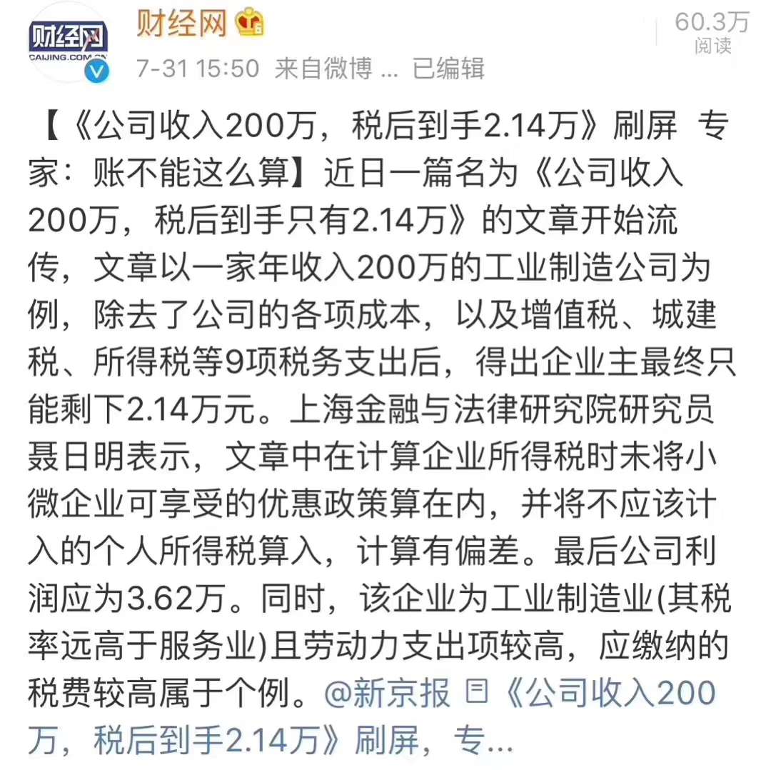 在国内开公司如果收入是200万,那么税后到手是2.14万元是谣言哈,大家别再信了!我朝企业生存环境没那么差的!有专家辟谣了哈,税后应该是3.62万。