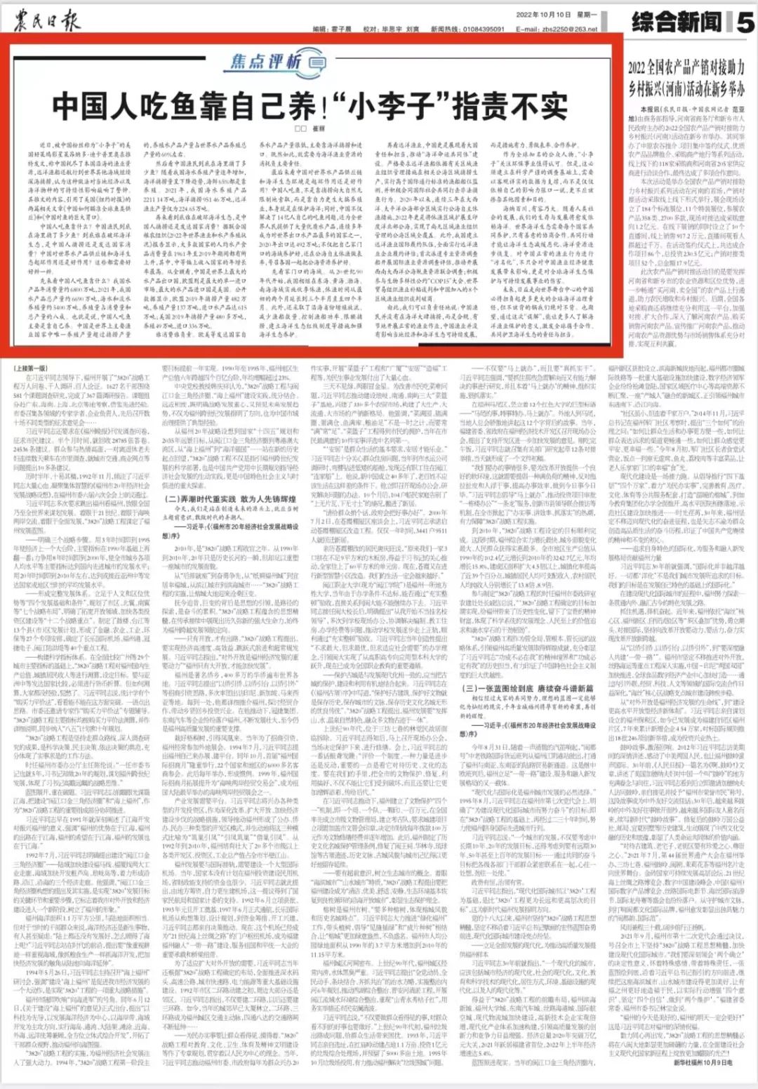 农民日报:中国人吃鱼靠自己养!“小李子”指责不实。