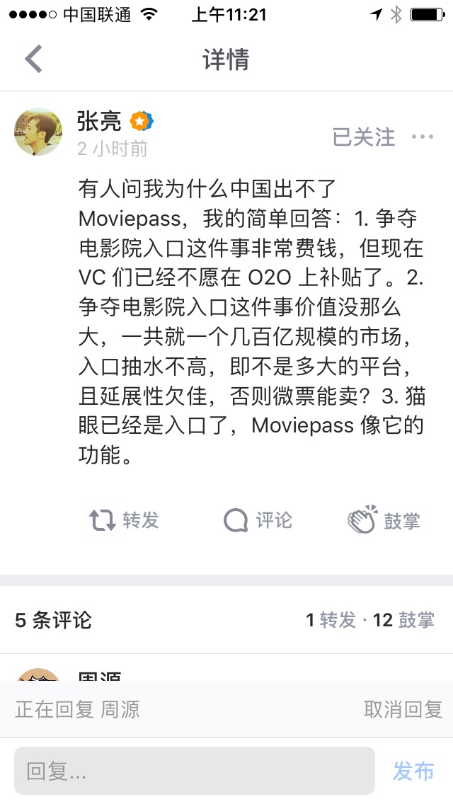 中国为什么出不了moviepass?图片里有个回答,挺有意思。顺便搬运下知乎周源的一些看法“票务市场看占有率,Moviepass 像是猫眼的促销手段,有价值,但独立存在的价值不大。”