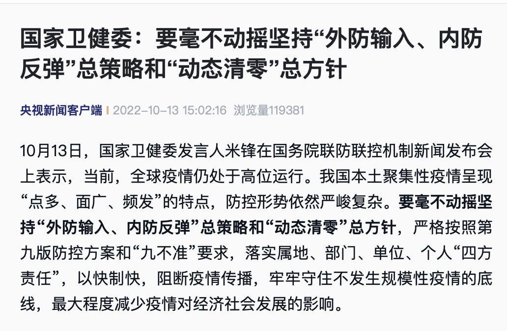 国家卫健委:要毫不动摇坚持“外防输入、内防反弹”总策略和“动态清零”总方针。国家卫健委发言人米锋13日在国务院联防联控机制新闻发布会上表示,当前,全球疫情仍处于高位运行。我国本土聚集性疫情呈现“点多、面广、频发”的特点,防控形势依然严峻复杂。要毫不动摇坚持“外防输入、内防反弹”总策略和“动态清零”总方针,严格按照第九版防控方案和“九不准”要求,落实属地、部门、单位、个人“四方责任”,以快制快,阻断疫情传播,牢牢守住不发生规模性疫情的底线,最大程度减少疫情对经济社会发展的影响。