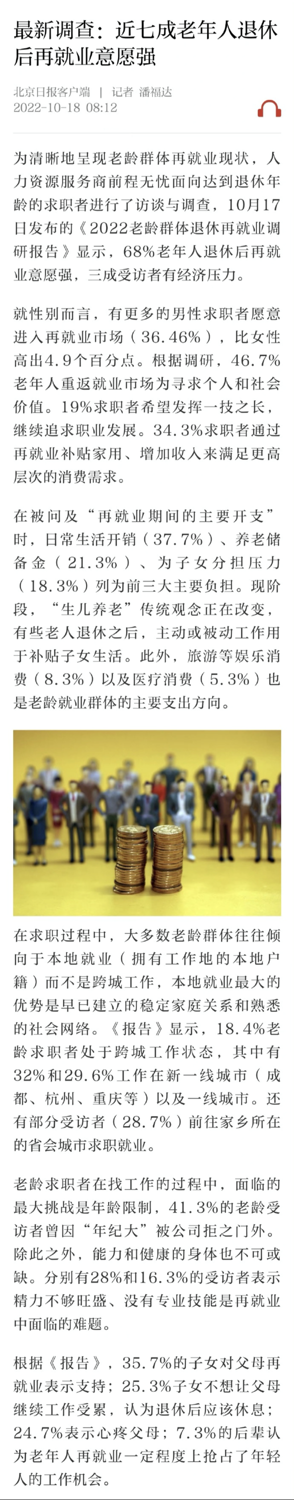 据北京日报,10月17日发布的《2022老龄群体退休再就业调研报告》显示,68%老年人退休后再就业意愿强,三成受访者有经济压力。根据调研,46.7%老年人重返就业市场为寻求个人和社会价值。19%求职者希望发挥一技之长,继续追求职业发展。34.3%求职者通过再就业补贴家用、增加收入来满足更高层次的消费需求。