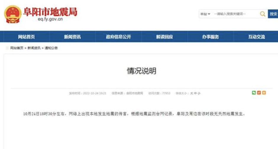 10月24日晚7时21分,阜阳市地震局官网发布情况说明称,10月24日晚6时30分左右,网络上出现该地发生地震的传言,根据地震监测台网记录,阜阳及周边在该时段无天然地震发生。10月25日,据阜阳市人民政府,已排除地震引发巨响的可能,具体原因正在调查中。