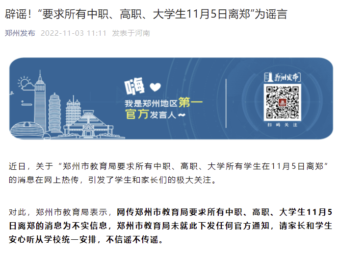 郑州市教育局:“要求所有中职、高职、大学生11月5日离郑”为谣言。“郑州发布”微信公众号消息,近日,关于“郑州市教育局要求所有中职、高职、大学所有学生在11月5日离郑”的消息在网上热传,引发了学生和家长们的极大关注。对此,郑州市教育局表示,网传郑州市教育局要求所有中职、高职、大学生11月5日离郑的消息为不实信息,郑州市教育局未就此下发任何官方通知,请家长和学生安心听从学校统一安排,不信谣不传谣。