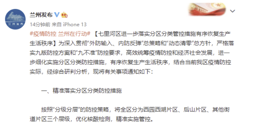 据兰州发布微博消息,兰州市七里河区新冠肺炎疫情联防联控领导小组办公室通告,为进一步细化实施分区分类防控措施,有序恢复生产生活秩序,结合当前七里河区疫情防控实际,经综合研判分析,现将有关事项通知如下: