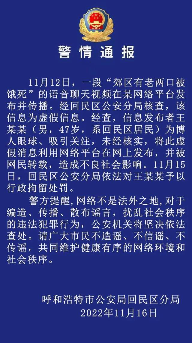 呼和浩特警方:发布“郊区有老两口被饿死”虚假信息,一男子被行拘。据“西城警事”微信公众号消息,呼和浩特市公安局回民区分局11月16日发布警情通报,11月12日,一段“郊区有老两口被饿死”的语音聊天视频在某网络平合发布并传播。经回民区公安分局核查,该信息为虚假信息。经查,信息发布者王某某(男,47岁,系回民区居民)为博人眼球、吸引关注,未经核实,将此虚假消息利用网络平台在网上发布,并被网民转载,造成不良社会影响。11月15日,回民区公安分局依法对王某某予以行政拘留处罚。