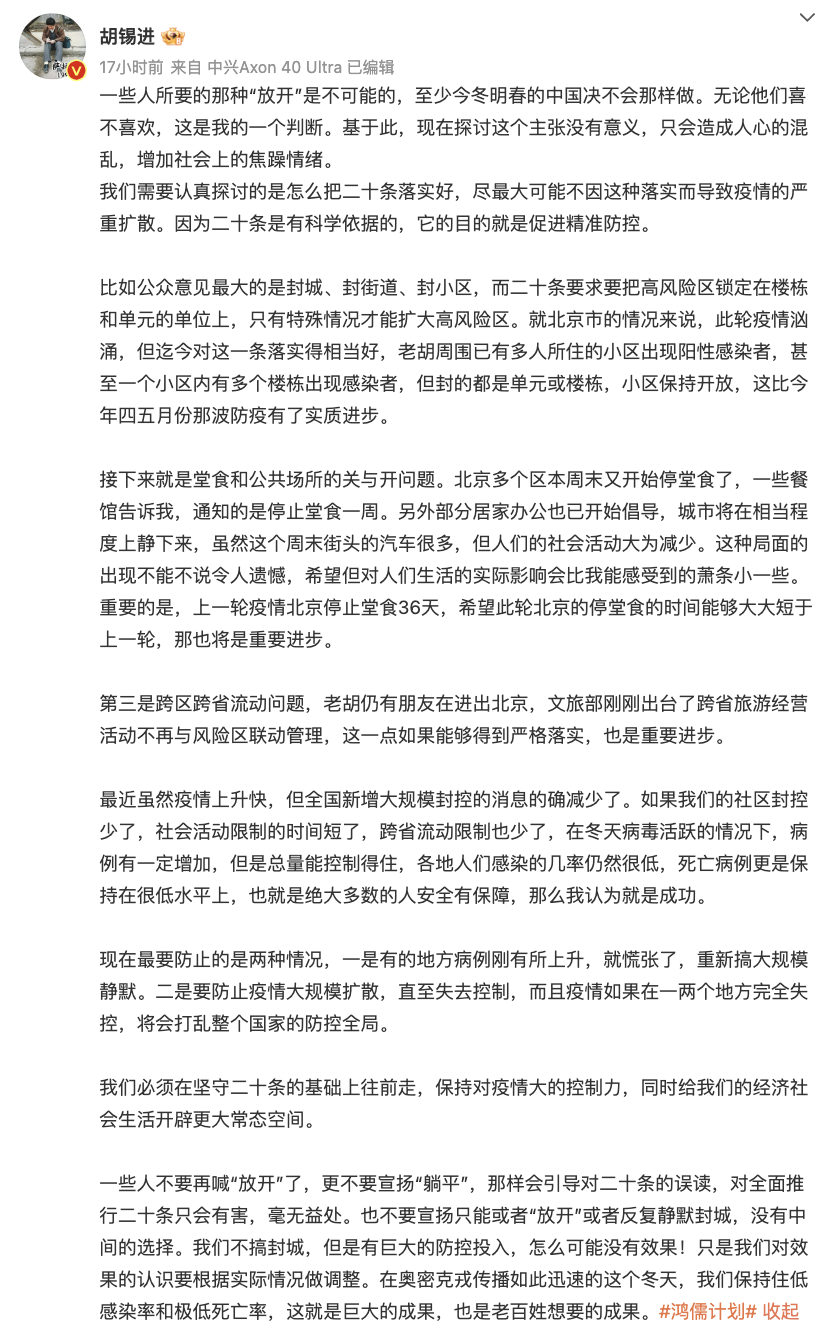 胡锡进:一些人不要再喊“放开”了,那样只会干扰二十条的全面落实。