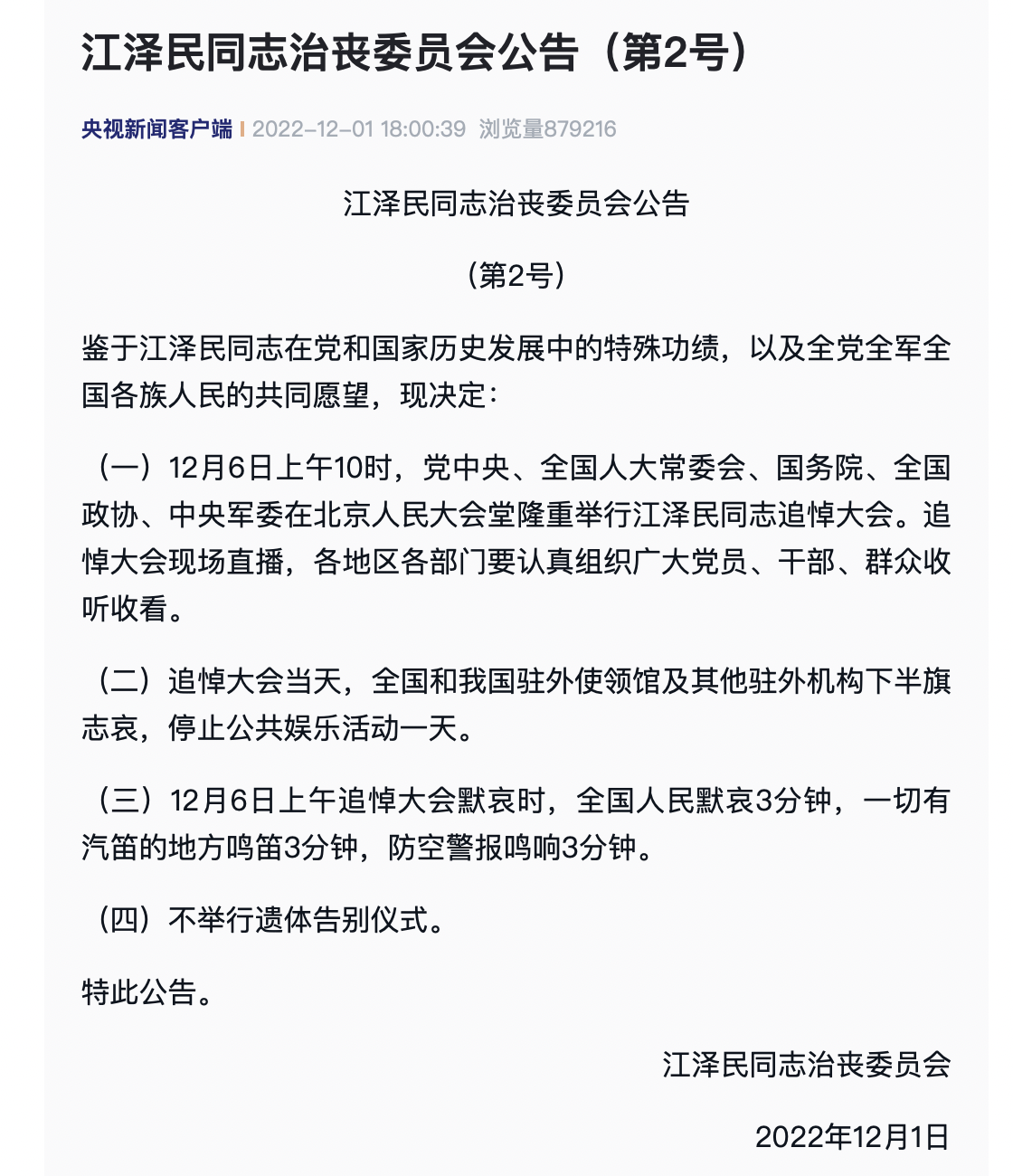 (一)12月6日上午10时,党中央、全国人大常委会、国务院、全国政协、中央军委在北京人民大会堂隆重举行江泽民同志追悼大会。追悼大会现场直播,各地区各部门要认真组织广大党员、干部、群众收听收看。