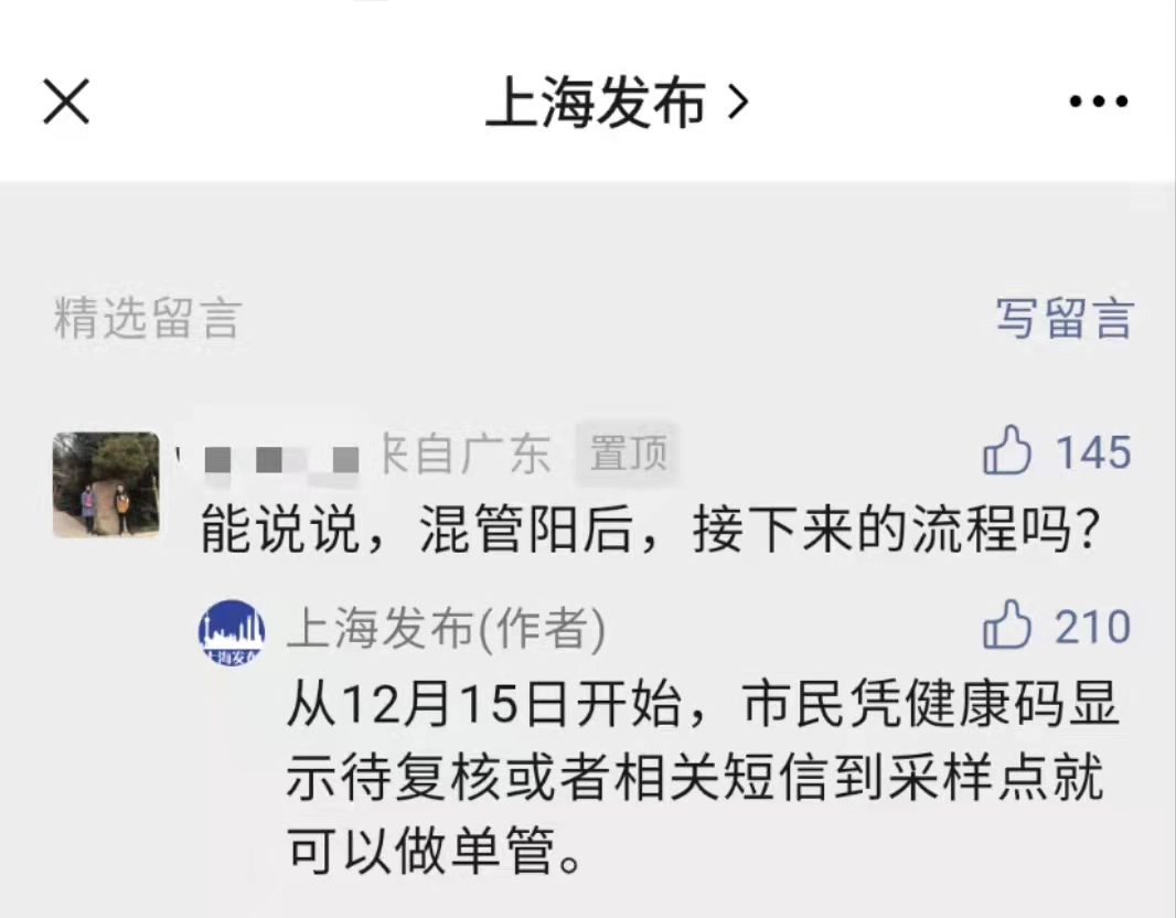 混管阳性如何做核酸?上海发布:凭健康码显示待复核或相关短信到采样点做单管。有网友今日在上海发布微信公众评论区留言问道,“能说说,混管阳后,接下来的流程吗?”对此,“上海发布”微信公号回复说,从12月15日开始,市民凭健康码显示待复核或者相关短信到采样点就可以做单管。
