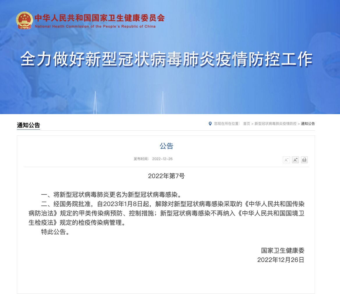 国家卫健委:将新冠肺炎更名为新型冠状病毒感染,1月8日起实施“乙类乙管”。国家卫健委:将新型冠状病毒肺炎更名为新型冠状病毒感染;经国务院批准,自2023年1月8日起,解除对新型冠状病毒感染采取的《中华人民共和国传染病防治法》规定的甲类传染病预防、控制措施;新型冠状病毒感染不再纳入《中华人民共和国国境卫生检疫法》规定的检疫传染病管理。