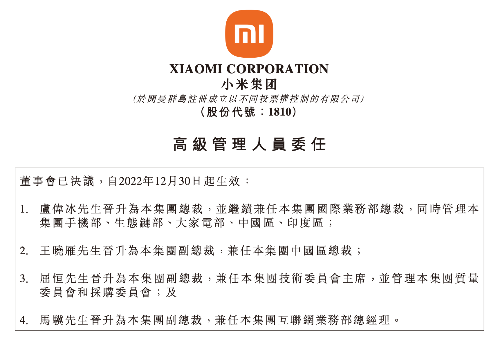 小米集团:卢伟冰晋升为总裁,王晓雁等晋升为副总裁。12月30日,小米集团在港交所公告,卢伟冰晋升为本集团总裁,并继续兼任本集团国际业务部总裁,同时管理本集团手机部、生态链部、大家电部、中国区、印度区。王晓雁晋升为本集团副总裁,兼任本集团中国区总裁;屈恒晋升为本集团副总裁,兼任本集团技术委员会主席,并管理本集团质量委员会和采购委员会;马骥晋升为本集团副总裁,兼任本集团互联网业务部总经理。