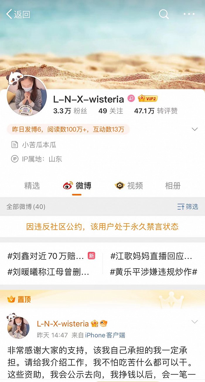 刘鑫微博被禁言。据界面新闻,1月4日消息,刘鑫(现用名刘暖曦)微博账号个人页面显示,“因违反社区公约,该用户处于永久禁言状态。”另据中国新闻周刊,江秋莲诉刘暖曦案二审宣判第五天,围绕法院判决的近70万赔偿,1月3日,江秋莲在微博发文披露,刘暖曦(曾用名:刘鑫)正对法院判决的赔偿款发起网络募捐,江秋莲申请微博管理员处理和关闭刘鑫的微博账户。刘鑫在2日晚和3日通过微博先后回应募捐称,“会公示去向”,称打工挣钱后会全部归还。
