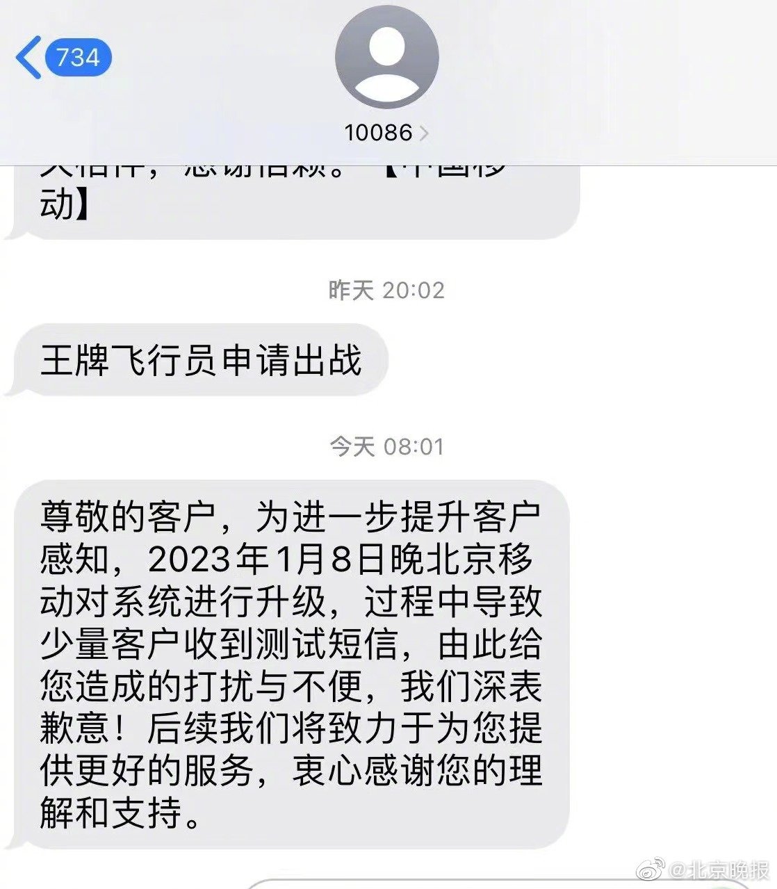 1月8日晚,不少北京市民收到来自10086的奇怪短信,内容为“王牌飞行员申请出战”,9日上午移动回应称其为测试短信,如有打扰深感抱歉。