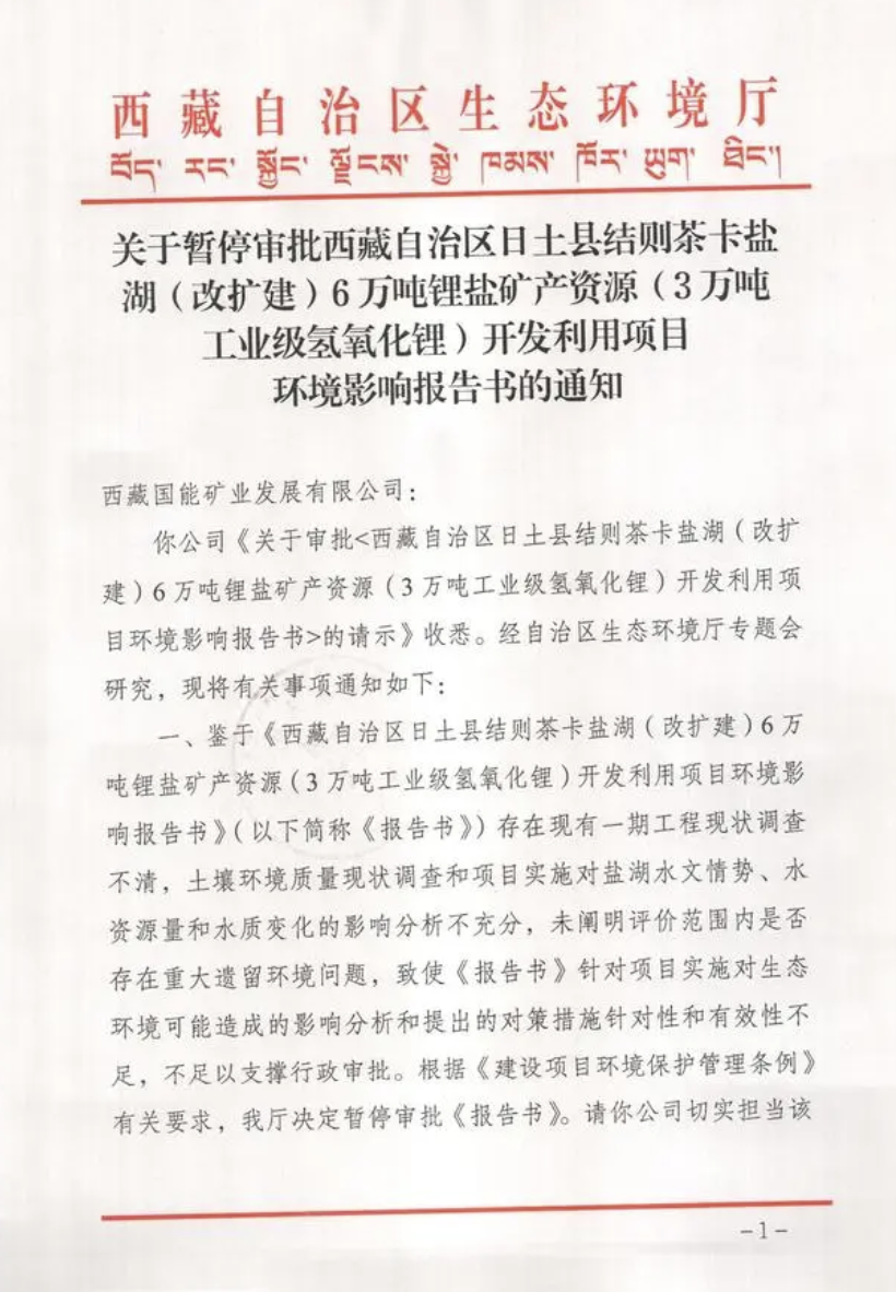 西藏城投参股企业国能矿业的结则茶卡盐湖项目环评被暂停审批。1月20日,据财联社,西藏自治区生态环境厅今日披露通知显示,鉴于国能矿业(西藏城投持有其41%股权)的《西藏自治区日土县结则茶卡盐湖(改扩建)6万吨锂盐矿产资源(3万吨工业级氢氧化锂)开发利用项目环境影响报告书》存在现有一期工程现状调查不清,土壤环境质量现状调查等的影响分析不充分及其他原因,西藏自治区生态环境厅决定暂停审批《报告书》,待《报告书》按照相关意见修改完善,再按规报审。