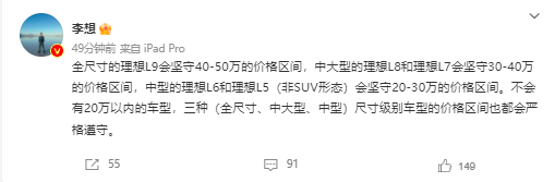 理想L5车型首次公布:不是SUV,价格坚守20万以上。理想CEO李想在微博发文表示,全尺寸的理想L9会坚守40-50万的价格区间,中大型的理想L8和理想L7会坚守30-40万的价格区间,中型的理想L6和理想L5(非SUV形态)会坚守20-30万的价格区间。不会有20万以内的车型,三种(全尺寸、中大型、中型)尺寸级别车型的价格区间也都会严格遵守。