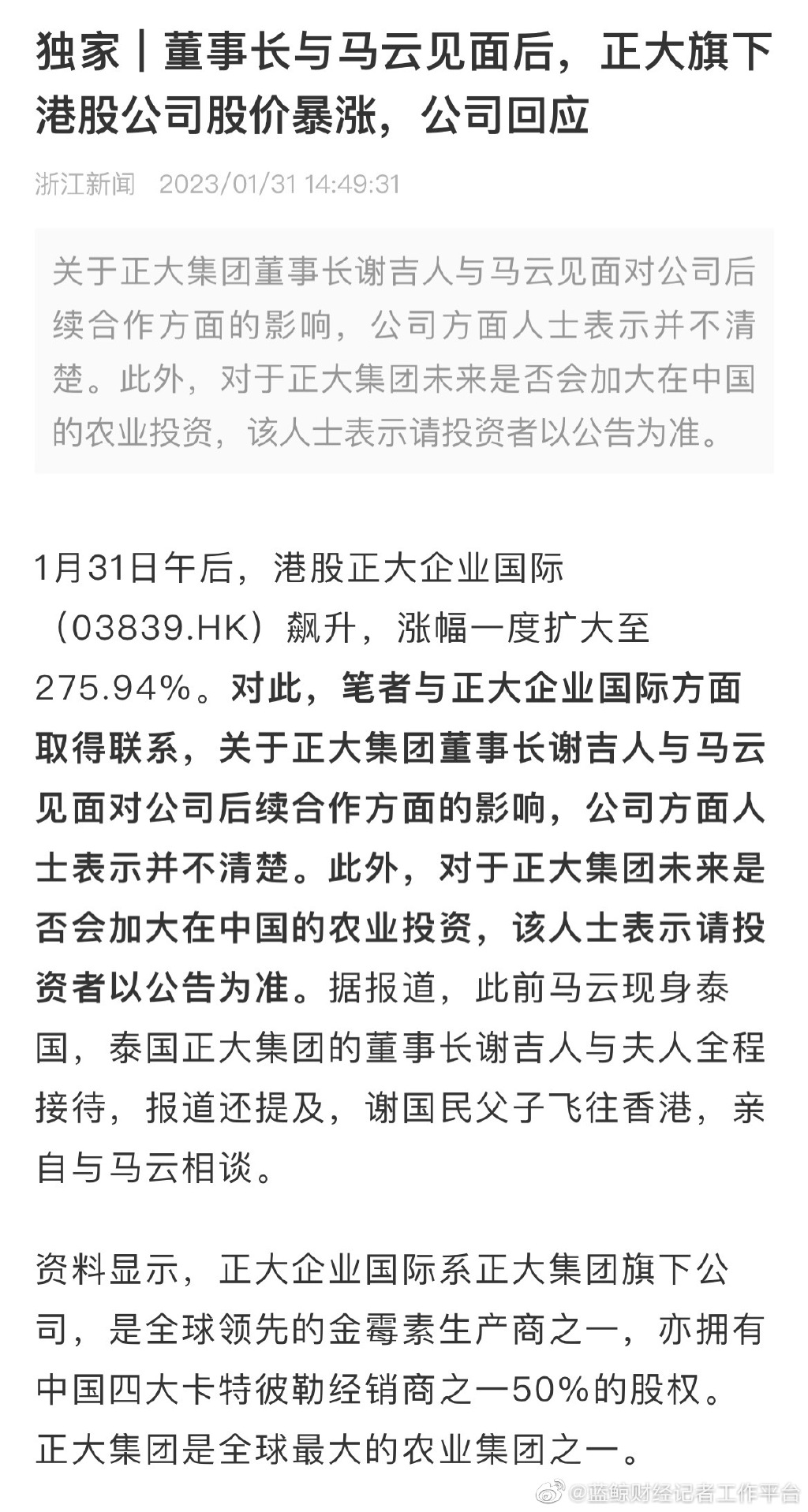 据蓝鲸财经综合银柿财经,1月31日午后,港股正大企业国际飙升,涨幅一度扩大至275.94%。对此,笔者与正大企业国际方面取得联系,关于正大集团董事长谢吉人与马云见面对公司后续合作方面的影响,公司方面人士表示并不清楚。此外,对于正大集团未来是否会加大在中国的农业投资,该人士表示请投资者以公告为准。据报道,此前马云现身泰国,泰国正大集团的董事长谢吉人与夫人全程接待,报道还提及,谢国民父子飞往香港,亲自与马云相谈。
