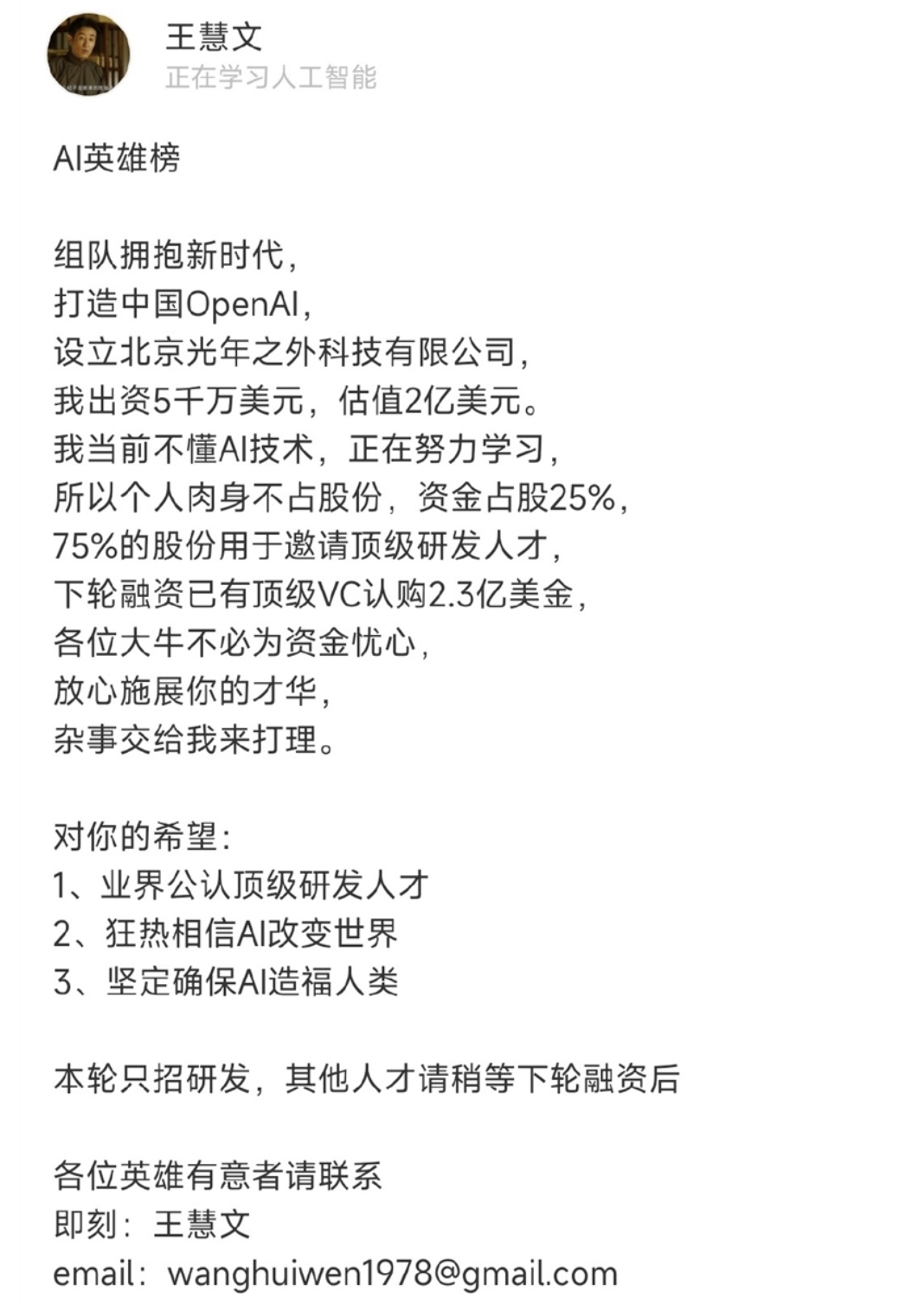 王慧文称,将成立北京光年之外科技有限公司,出资5000万美元,估值2亿美元(约13.62亿元人民币),并表示,他个人不占股份,资金占股25%,75% 的股份用于邀请顶级研发人才,下轮融资已有顶级 VC 认购2.3亿美元(约15.66亿元人民币)。