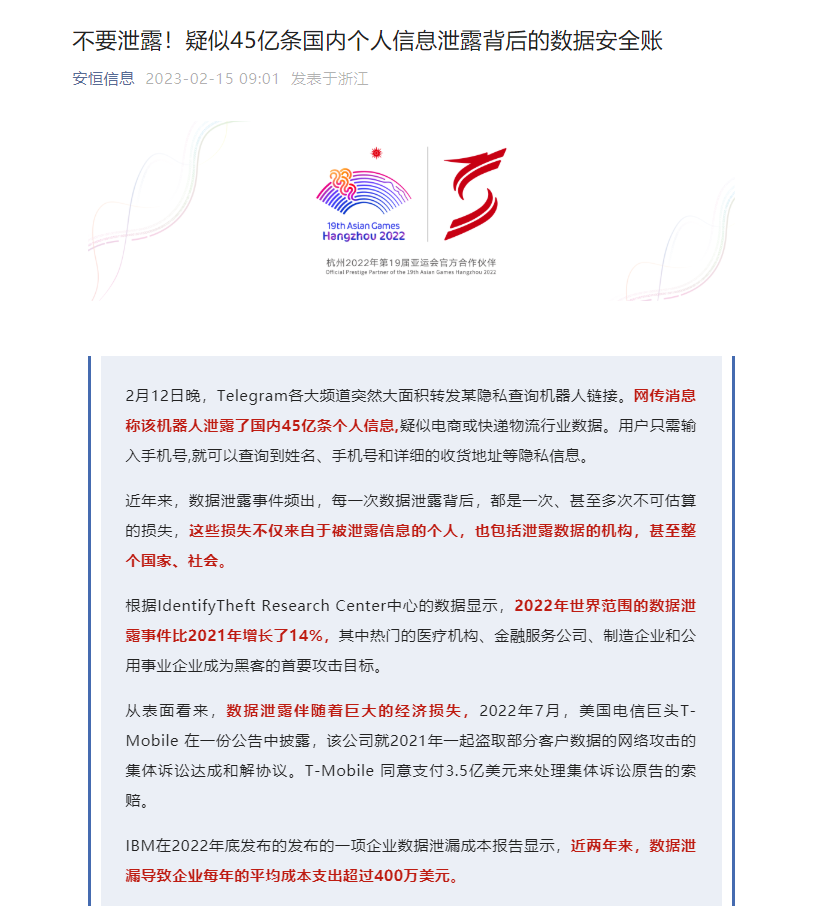 据上证报,安恒信息官方微信号15日早间发布消息称:“2月12日晚,Telegram各大频道突然大面积转发某隐私查询机器人链接。网传消息称该机器人泄露了国内45亿条个人信息,疑似电商或快递物流行业数据。用户只需输入手机号,就可以查询到姓名、手机号和详细的收货地址等隐私信息。”