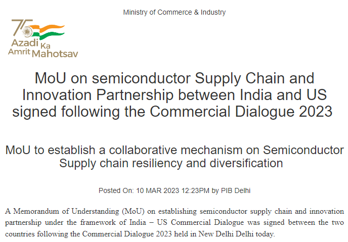 美国与印度签署半导体供应链合作协议。印度贸易部3月10日发布声明称,在美国商务部长雷蒙多访印期间,印度和美国于当地时间周五签署谅解备忘录,拟在加强半导体供应链韧性和多元化方面建立合作机制。该协议旨在利用两国互补的优势,促进半导体创新生态系统的商业机会和发展。谅解备忘录设想两国在互惠互利的研发、人才和技能发展方面合作。