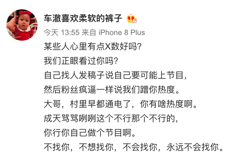 中国新说唱导演车澈忍不住了,终于出手了,发了条微博正面刚陈老师。“有点逼数好吗?”“我们正眼看过你吗?”“你有啥热度啊?”车澈当然不会找陈冠希,因为节目不允许选手有黑历史,当然导师也不能有。之前,就有网友在陈冠希 instagram 上评论说他不如吴亦凡,陈冠希进行了回怼:“如果算上伪装和说谎,那确实不如吴亦凡。”