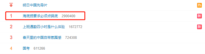 此前,海底捞就因“牛肉粒变素”、“缺斤少两”等话题多次登上微博热搜。