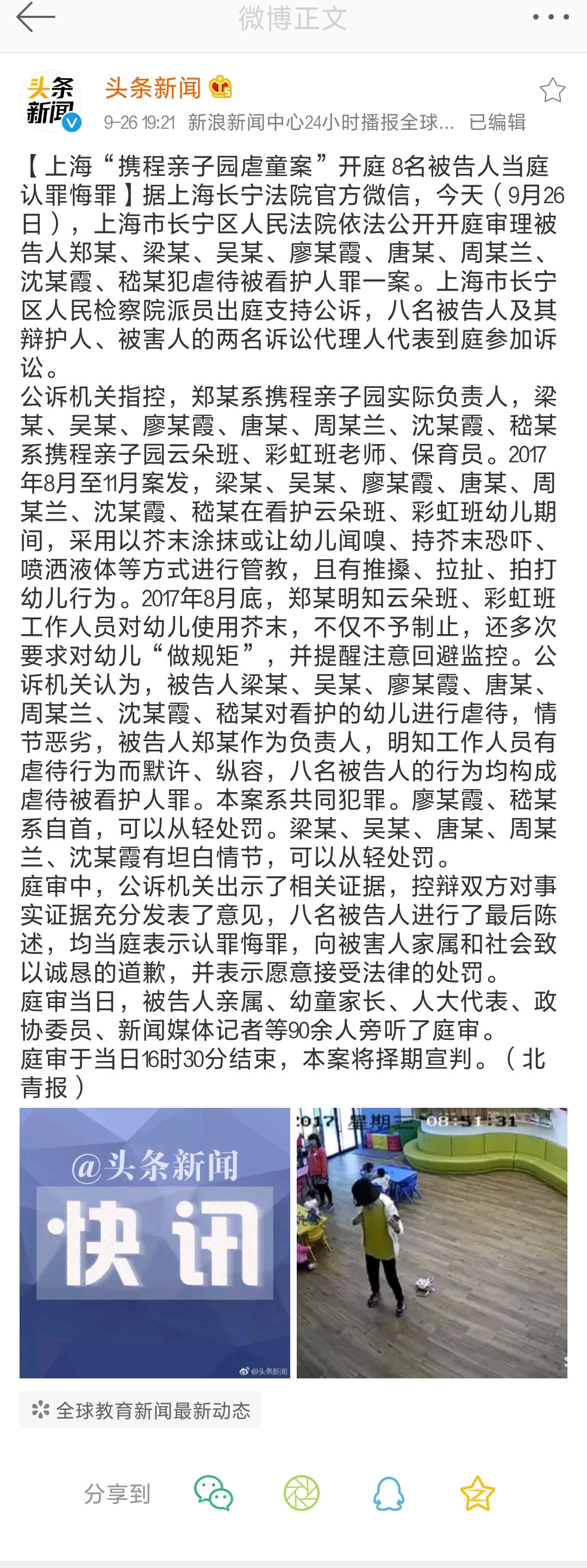 上海“携程亲子园虐童案”开庭,8名被告人当庭认罪悔罪。今天,上海市长宁区人民法院依法公开开庭审理被告人郑某、梁某、吴某、廖某霞、唐某、周某兰、沈某霞、嵇某犯虐待被看护人罪一案。八名被告人均当庭表示认罪悔罪,向被害人家属和社会致以诚恳的道歉,并表示愿意接受法律的处罚。