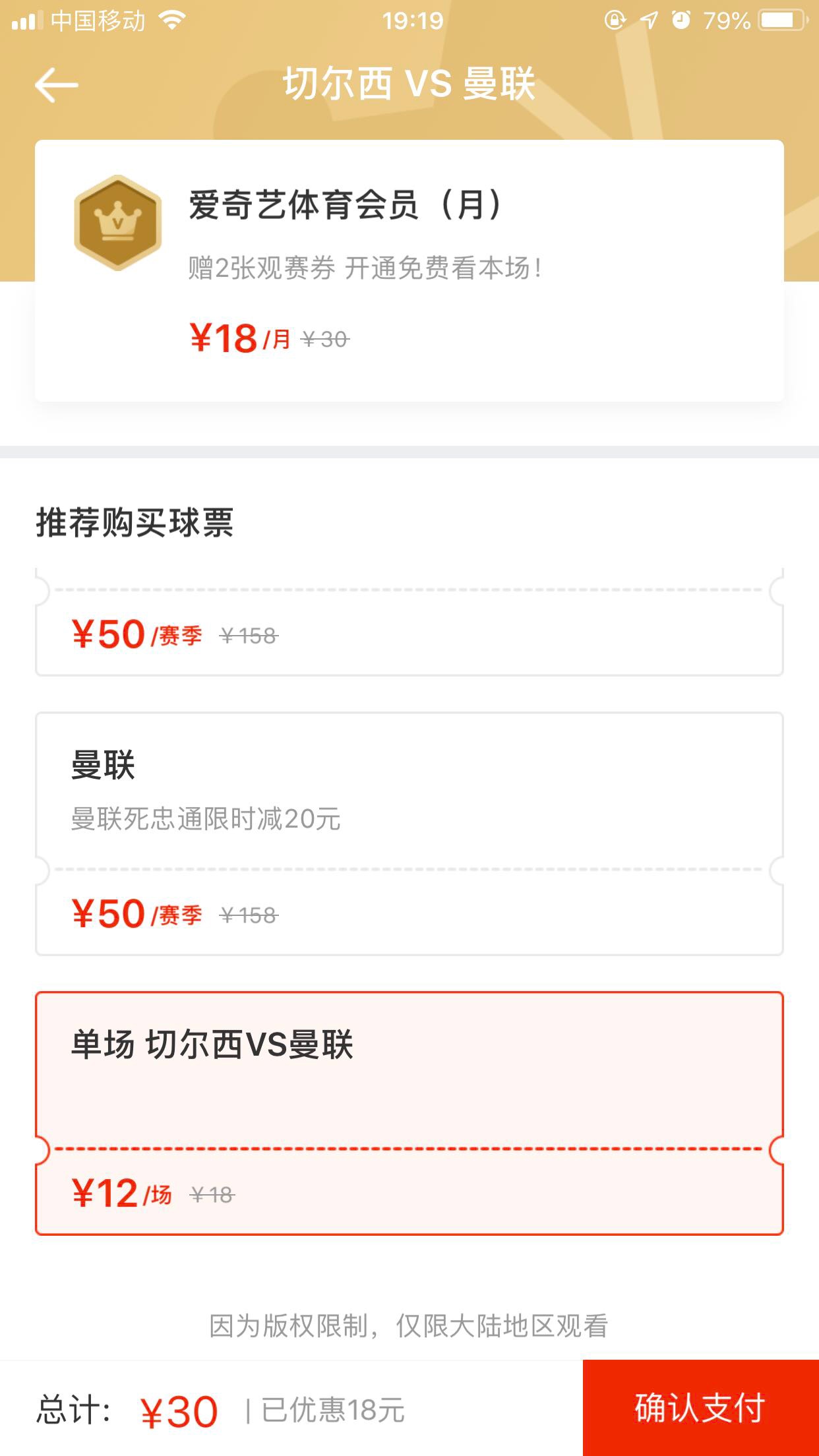 爱奇艺如何强行绑定体育会员和英超比赛、又如何差别对待iOS、安卓用户的(都是同一账户)…for iOS:爱奇艺体育会员18元/月,单场12元;for 安卓:爱奇艺体育会员10元/月,单场10元;(当然你买了死忠包就可以不用绑定购买体育会员,但iOS和安卓的价格也不同)