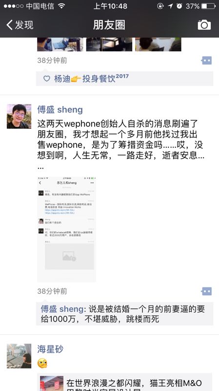 猎豹移动CEO傅盛在朋友圈为WePhone创始人自杀一事发声: