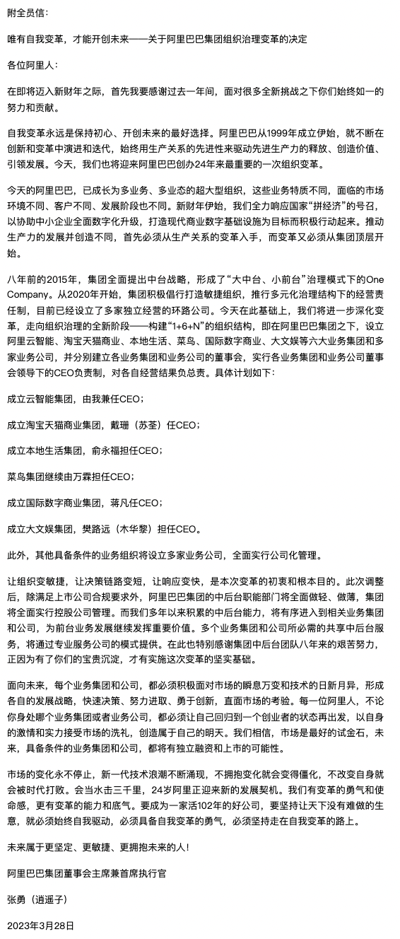 3月28日,阿里巴巴集团董事会主席兼首席执行官张勇发布全员信《唯有自我变革,才能开创未来》,启动新一轮公司治理变革。