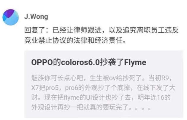 OPPO公司在Color OS的5周年庆祝活动上表示Color OS 6将引入“无边界”理念,提高设计美感。一些魅族粉丝觉得Color OS 6抄袭了魅族的Flyme OS。魅族创始人黄章在魅族论坛上表示,“已经让律师跟进,以及追究离职员工违反竞业禁止协议的法律和经济责任。” 评:国产手机竞争激烈,厂商之间互怼也是见怪不怪。对于OPPO是否抄袭魅族还有待考证,时间终会证明。