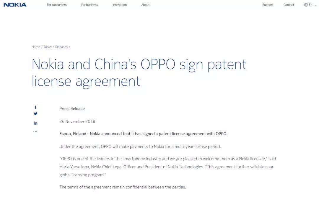 诺基亚发公告称,目前其已经与 OPPO 签署了多年的专利授权协议。协议内容大致是 OPPO 所获专利授权的类目,更为具体的授权内容、授权费用诺基亚表示不对外公开。 评:昔日的手机巨头,难道要靠专利使用费而苟活吗?复兴之路从何谈起?