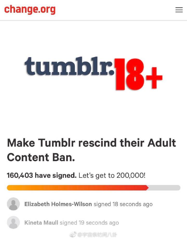 有人在著名的请愿网站Change.org上发起了“tumblr撤回关于禁止成人内容的决定”的请愿,仅仅14个小时内已经有16万人签名。