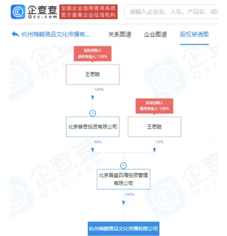 企查查股权穿透显示,杭州梅鹤雅品文化传播有限公司由北京昌盛四海投资管理有限公司全资控股,后者由北京普思投资有限公司持股90%,王思聪为实际控制人。