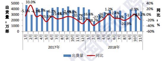 中国信通院发布《2018年11月国内手机市场运行分析报告》,数据显示,今年11月,中国手机出货量达到3.54亿台,同比下降18.2%,环比下降8.2%;今年1至11月,国内手机市场出货量为3.79 亿部,同比下降15.6%。 评:手机彻底进入存量市场,小玩家们是坚守还是卖出,该做出决定了。