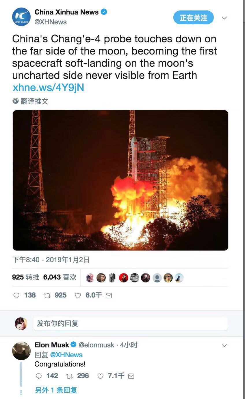 嫦娥四号成功着陆,成为人类首访月球背面的探测器。马斯克给新华社twitter动态第一时间留言“Congratulations!”,点赞数比原动态还多...莫名戳中萌点😂