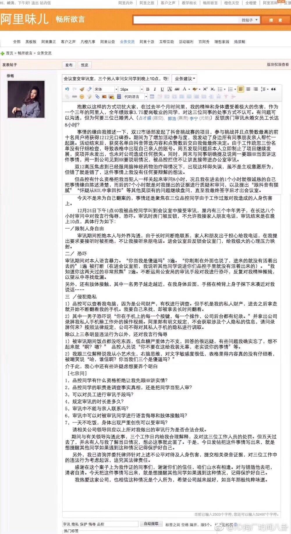 一个大瓜:阿里女员工发文说,三男员工擅自审问未婚女员工8小时🤪