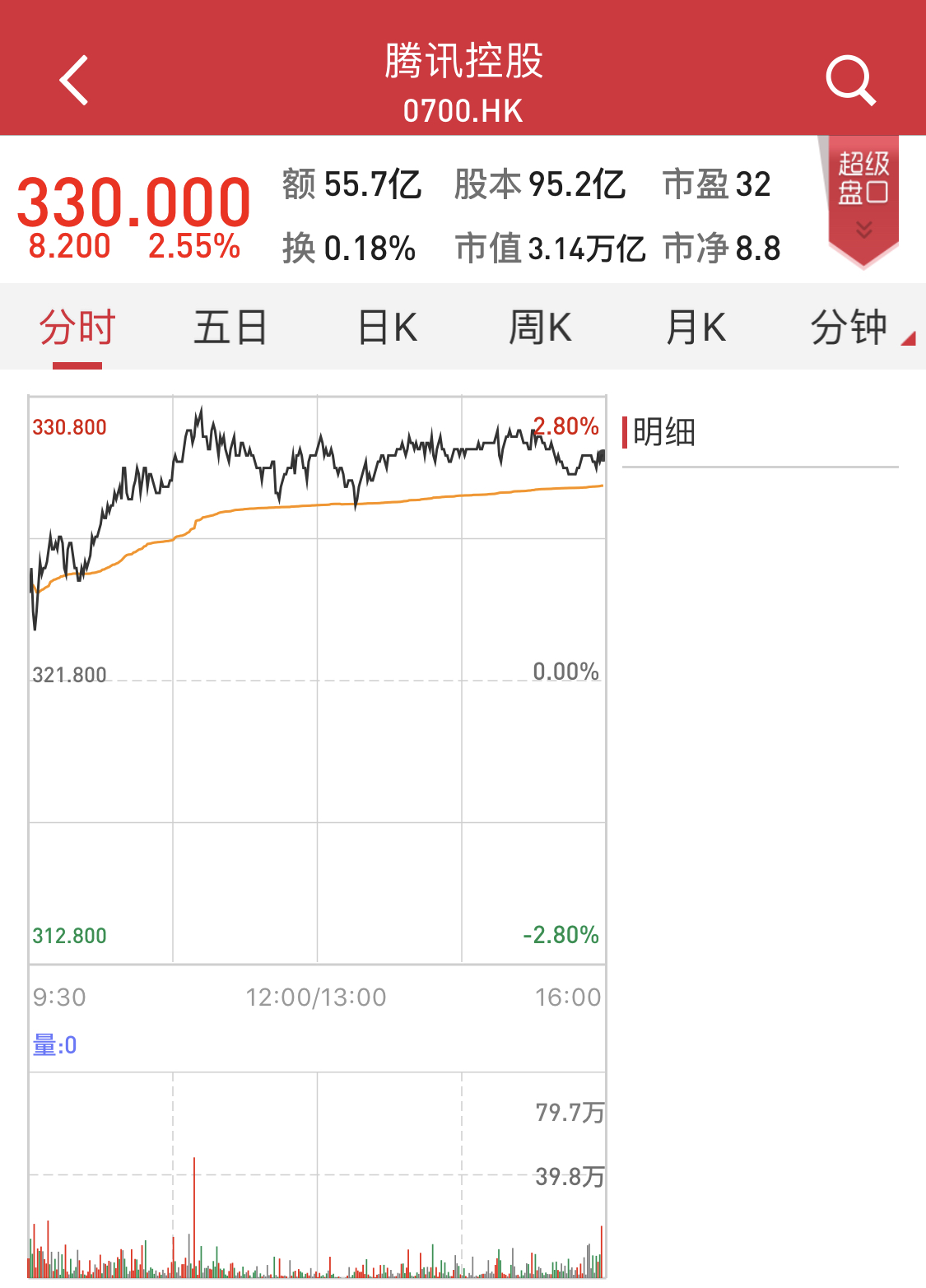 三款社交竞品今日发布,腾讯控股收盘报330港元,股价涨幅2.55%。