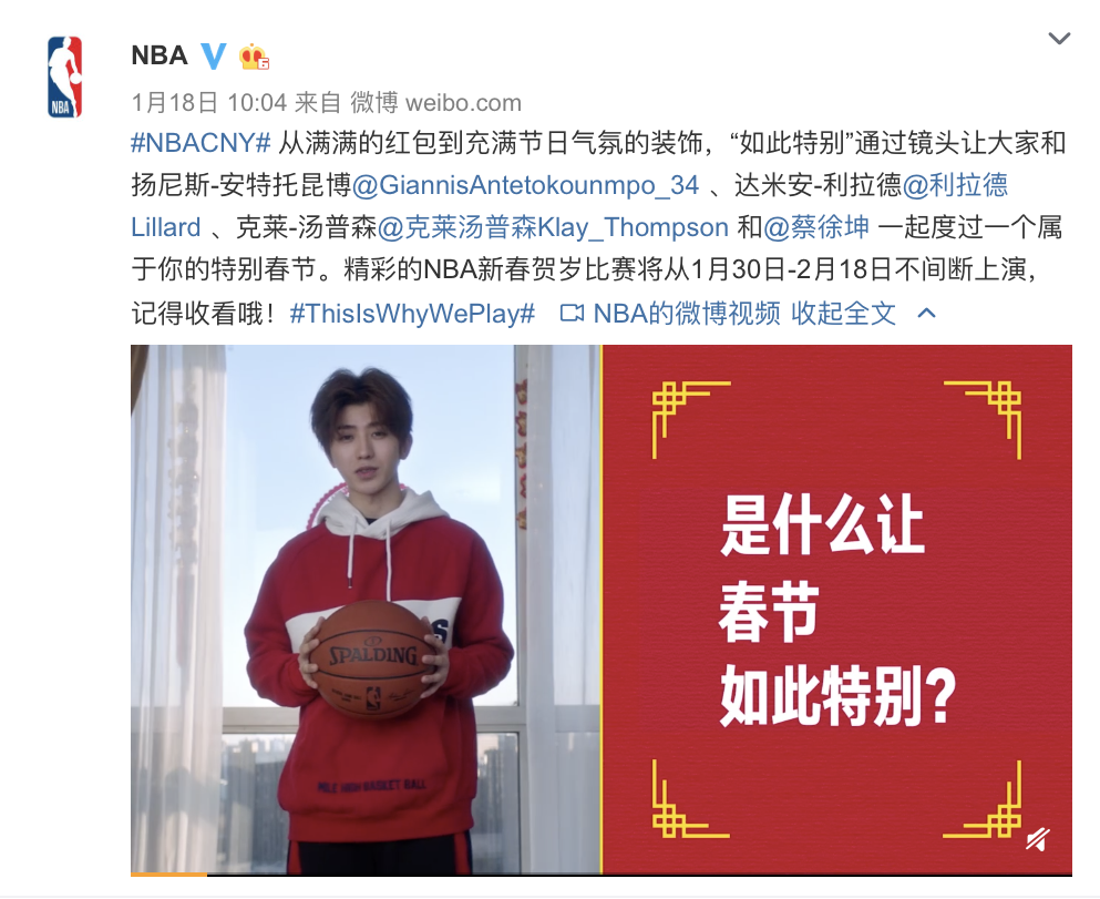 NBA向流量鲜肉低头。18日,NBA官微宣布蔡徐坤成为首位NBA新春贺岁形象大使,并发布了一支广告,蔡老师与克莱·汤普森、达米安·利拉德以及"字母哥"安特托昆博3位NBA巨星同框。目前,NBA微博评论区已经被“IKUN”(蔡徐坤粉丝)控制,虎扑网友也及时赶到,场面异常刚烈,程度与上次“吴老师事件”相当。蔡老师以“惊人的球技”取代吴老师成为虎扑网友新的diss对象。