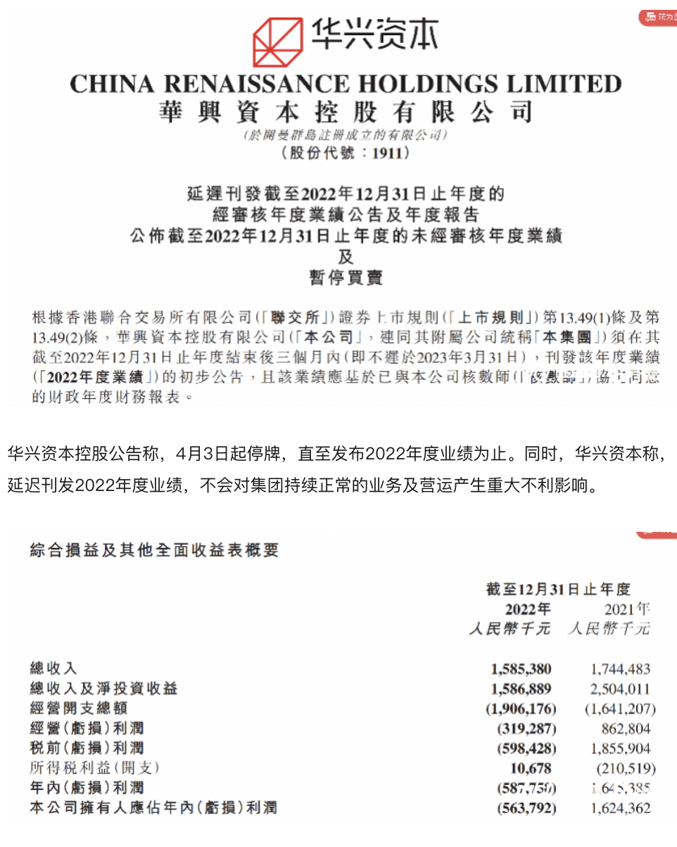 4月3日,华兴资本控股发布公告,延迟刊发2022年度的经审核年度业绩公告及年度报告,因接获审计师通知,在审计师联系到失联的主席、执行董事、行政总裁及控股股东包凡前,无法签发审计师报告。华兴资本审计师为德勤·关黄陈方会计师行。